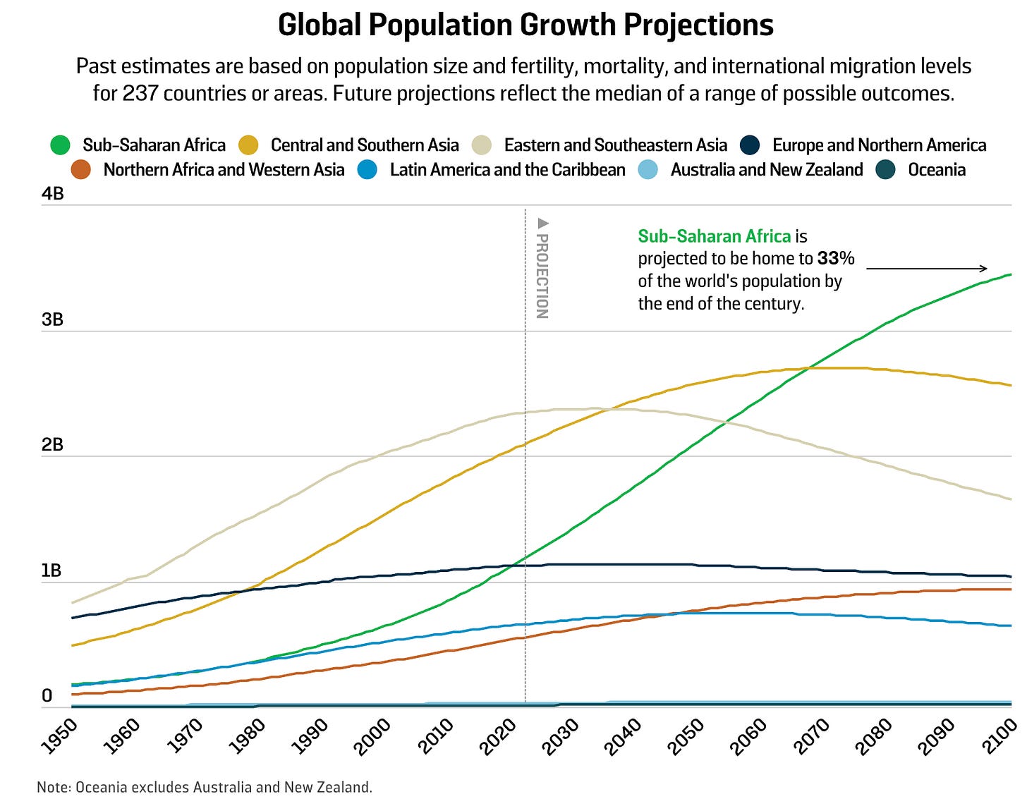 In his (excellent, highly recommend) recent-ish book Youthquake, Edward Paice argues that African population growth should not be viewed through the outdated lens simply of a “population explosion,” but really a seismic shift with ripple effects far beyond population numbers. That said, the data (and what it means) is staggering: By 2050, Africa will account for 25% of the world’s population, rising to 33% by 2100. I return to this graphic from Foreign Policy because of its simplicity in articulating this statistic:
