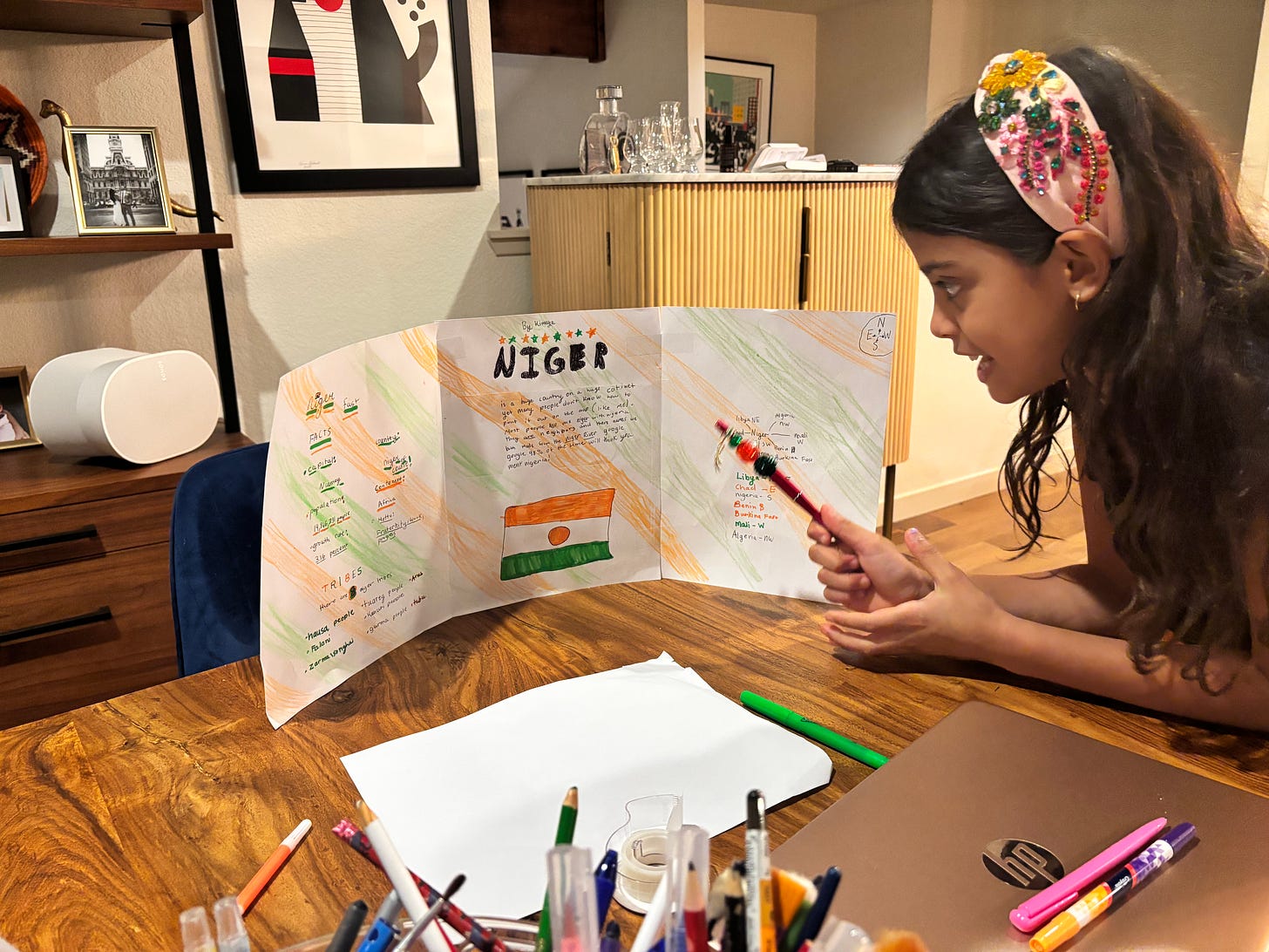 Now, for the food! We made Djerma Stew and used more or less the recipe linked (but tripled the garlic, duh). My son researched that there is such a thing as a Nigersaurus, my daughter did a whole cutie pie research project, and we danced around to music by Bombino. If you are curious (as we were) about the history of peanuts since peanut butter is a star ingredient, check out this illuminating history of the peanut and how it made its way to Africa and African cuisine.
