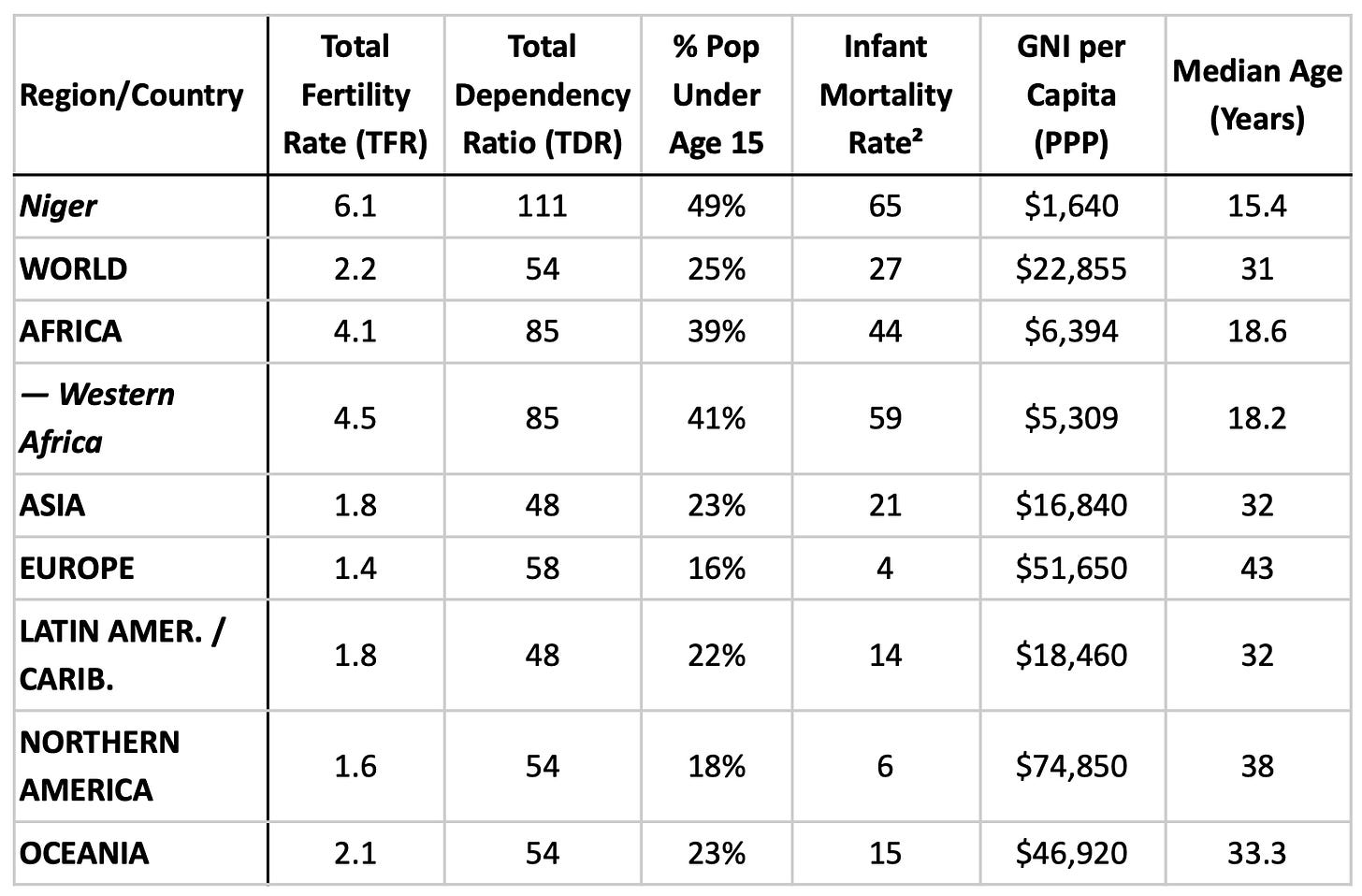 Niger made sense as a kick-off country for reasons that are obvious to demographers, but likely not to many others. It is the global frontier of population trends—the youngest country in the world, the most fertile country in the world, has the highest age-dependency ratio in the world and so on. To put that in perspective, Niger isn’t just an outlier compared to the West; it is an outlier even within its own neighborhood.